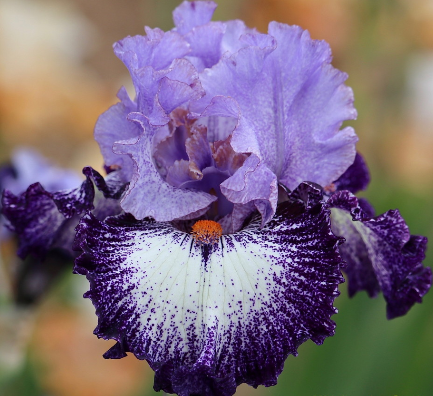 - Falls: White ground with wide deep purple to deep navy plicata band