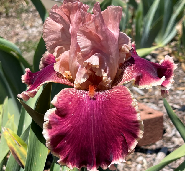 For gardeners drawn to drama, Splendida is an unmissable star. Its ruffled, rose-pink standards rise above bold, velvety falls in shades of garnet and plum, each petal edged with a soft, creamy glow. The whole flower glows like antique silk under late afternoon light — refined, romantic, and unmistakably lush. An orange beard adds just enough fire to ground the composition. Splendida brings a sense of richness and contrast that makes it perfect as a focal point in both formal and more expressive gardens.